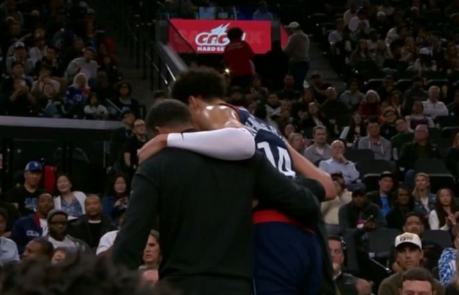 本场比赛,快船替补中锋在第二节遭遇了伤病,当时步行者的进攻回合,内史密斯突破上篮被尼德豪泽大帽扇掉,但是在落地时,尼德豪泽扭到了右脚,当时他就疼得一直拍地板。